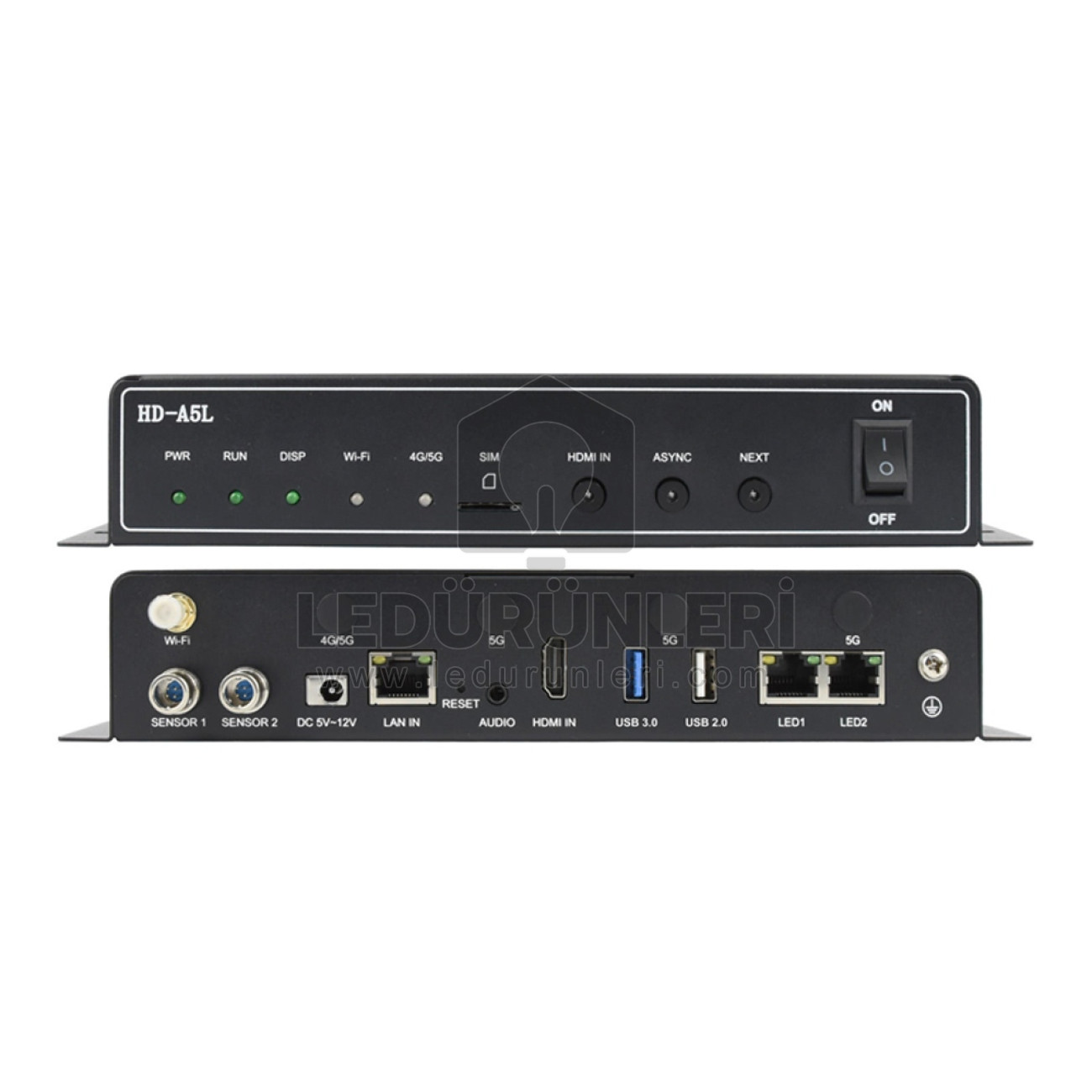 HD-A5L; LED ekranlar için tasarlanmış, asenkron oynatma ve HDMI ile senkron oynatma modlarını bir arada sunan güçlü bir multimedya kontrolcüdür. Dahili Wi-Fi, USB ve Gigabit Ethernet ile içerik dağıtımı kolaylaşır; çok pencereli video oynatma, zamanlama ve uzaktan küme yönetimi gibi profesyonel özellikler sağlar.